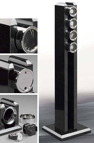 • Шкатулка для хранения 4-х часов с автоматическим заводом. • Механизм ELMA Technology (Германия). • Материал: индийский гранит "черная галактика" с хромированными латунными вставками. • Внутренняя отделка: натуральная кожа черного цвета. • Скорость вращения около 8 оборотов в минуту. • Уровень шума не более 5dB. • Одна программа, позволяющие достичь за сутки 90-100% резерва хода: 6 минут по часовой стрелке, "отдых" 30 минут. 6 минут против часовой стрелки. 1920 оборотов в сутки. • Гарантия 2 года. • Производство - Австрия.